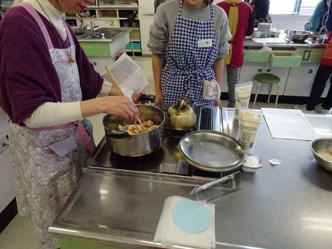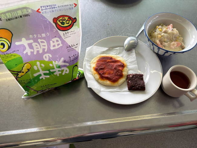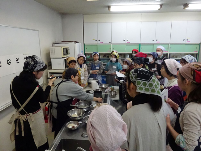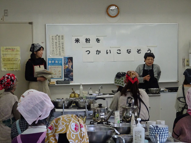 ピザとブラウニーは米粉とお豆腐を混ぜて作り、クリームシチューは豆乳と米粉を使用しました。他にも楠本さんからは米粉の使い分けや効能についてもお話をしていただき参加者はメモを片手に真剣にお話を聞いていました。
