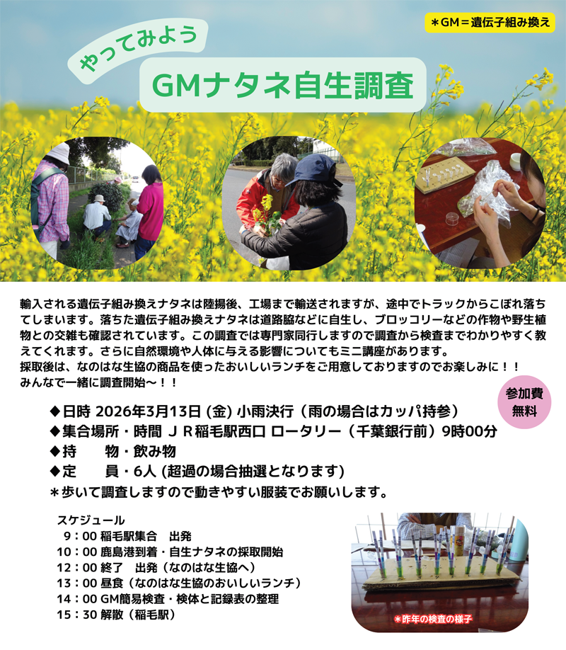 当日は、「遺伝子組換え食品いらない!キャンペーン」の方々と一緒に調査活動を行います。