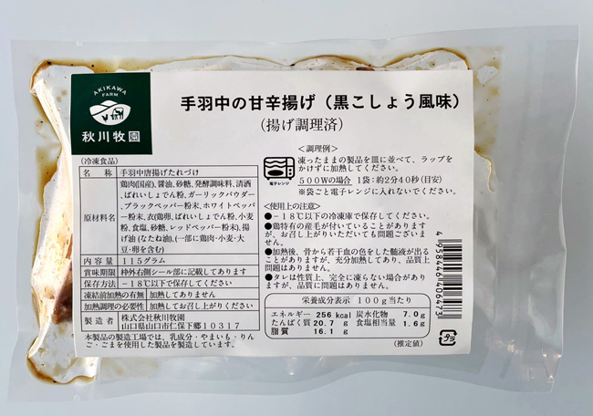 秋川牧園の鶏の手羽中を唐揚げにした後、醤油ベースにブラックペッパーとホワイトペッパーのダプルペッパーの自家製の甘辛タレをからめました。温めるだけの簡単調理でおつまみやスナック感覚で手軽にいただけます。約5~8本入り。