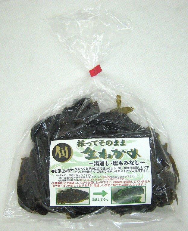 宮城県石巻市で採取してそのままパックした湯通しをしていない茎もついた生わかめです。