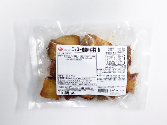 ニッコーの自社農園の国産さつまいもカットし、遺伝子組み換え分別生産管理済みの菜種油で素揚げして砂糖やはちみつで作ったタレをからめました。自然解凍もしくは、レンジで温めてお召し上がりください。