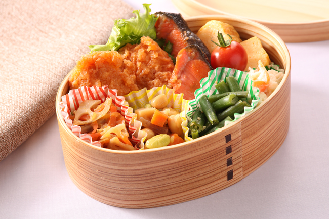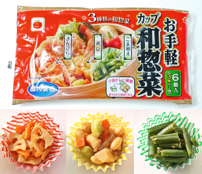 いんげんの胡麻和え・五目煮・れんこんのきんぴらをお弁当用に小分けにして紙カップに入れました。レンジで温めていただいても自然解凍でもお召し上がりいただけますので、大変便利です。凍ったままお弁当にも入れられます。